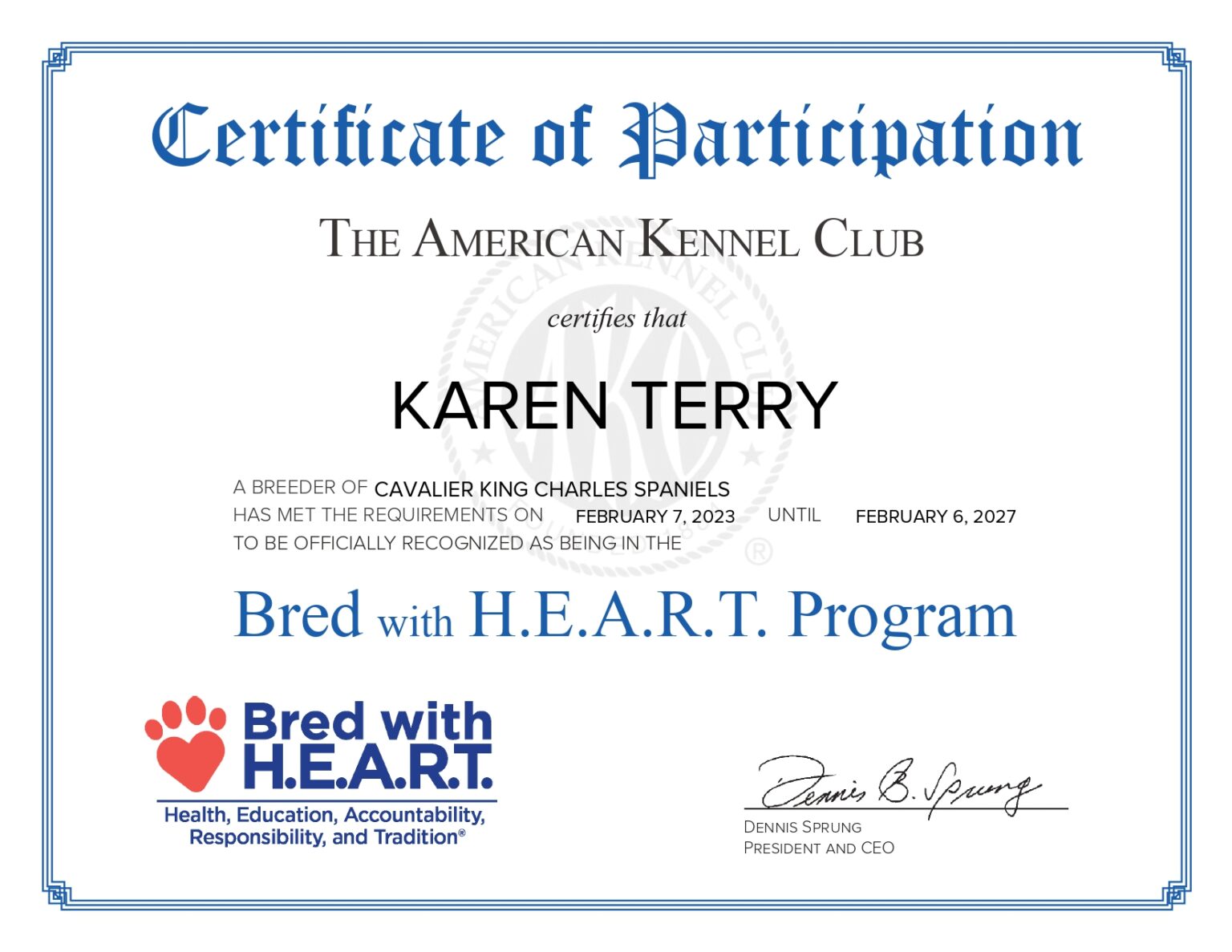At Royal Garden Cavaliers, we take pride in being a responsible and ethical breeder of Cavalier King Charles Spaniels. Our commitment to quality, health, and the well-being of our dogs is reflected in the certifications and affiliations we maintain.